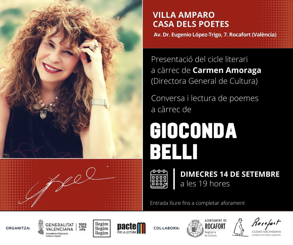 La escritora nicaragüense Gioconda Belli nos acompañó el miércoles, 14 de septiembre, abriendo con ello un ciclo literario de charlas programadas por la Generalitat Valenciana en Villa Amparo, Casa de poetas, la que fuera residencia de Antonio Machado en Rocafort. Colaboran en su gestión el servicio público y gubernamental, Llegim, llegim, llegim, Pacte, el Ayuntamiento de Rocafort y el Consejo Sectorial Rocafort Ciudad Machadiana.