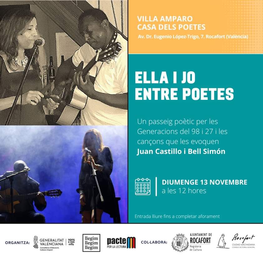 El domingo, 13 de noviembre de 2022, tuvimos la oportunidad de disfrutar, en Villa Amparo, de los versos y las canciones de Bell Simón, acompañada por el guitarrista Juan Castillo. Un recital para recordar a don Antonio Machado en un recorrido contextualizado por la época en la que vivió.