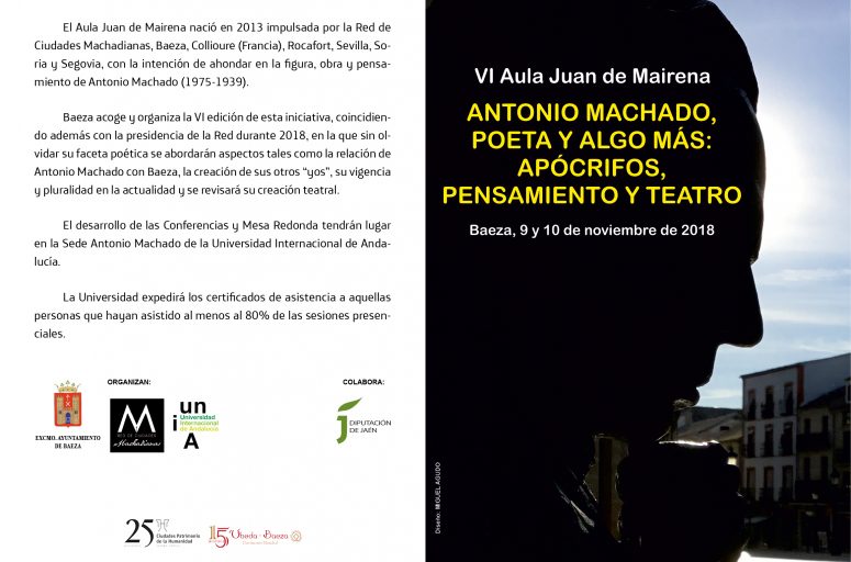 Ya puede consultarse el programa del VI Aula Juan de Mairena, las jornadas que organiza cada año la Red de Ciudades Machadianas en torno a Antonio Machado. En esta ocasión se celebra en Baeza, los próximos días 9 y 10 de noviembre.