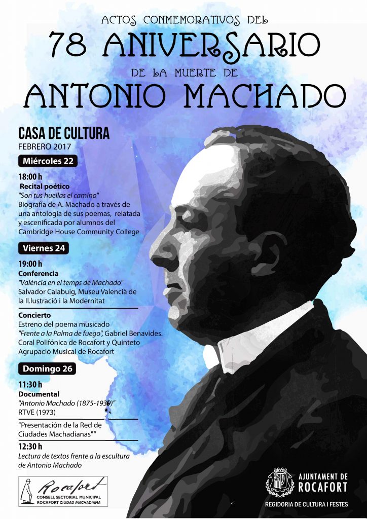 Rocafort conmemora los 78 años de la muerte de Antonio Machado con una serie de actos culturales abiertos a toda la población. El miércoles 22 el alumnado del colegio Cambridge realizará un recital poético que permitirá seguir su biografía, a las 18h. El viernes 24 de febrero a las 19h, Salvador Calabuig (MUVIM) expondrá la conferencia “València en el temps de Machado” y después la Coral Polifònica de Rocafort y el Quintet de la Agrupació Musical de Rocafort, estrenarán el poema musicado “Frente a la Palma de fuego”, de Gabriel Benavides. El domingo por la mañana completaremos el programa conmemorativo con la emisión del documental “Antonio Machado (1875-1939)” de RTVE (1973), para posteriormente hacer una presentación pública de la Red de ciudades machadianas. Finalmente a las 12.30h, frente a su escultura y Villa Amparo, habrá lectura de textos del poeta.